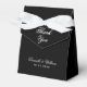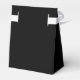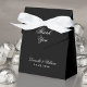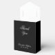 Une simple boîte de faveur de mariage noire avec un design classique et minimaliste. Le Merci du message sur le rabat (et sous celui-ci) et les noms (sur le devant, dans la partie inférieure) sont écrits en calligraphie élégante et la date en chiffres plus petits sous le nom. Tout le texte est blanc et peut être modifié.