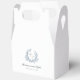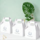 Un design simple moderne boîte de faveur de mariage en blanc avec une crête mariage feuillue en bleu poussiéreux entourant les initiales monogrammes de la mariée et du marié. Avec simplicité classique, ce design présente une belle police de caractères pour les noms de mariée et de mariée et une police de caractères serif traditionnelle pour la date. Ces élégants ballotins sont disponibles en 3 tailles pour votre commodité.
