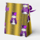 Un sac cadeau en or mignon et coloré avec un motif de petits bonhomme de neige vêtu de chapeaux et de gilets en velours violet, entouré d'étoiles dorées pour faire votre cadeau vraiment spécial cette saison de vacances.