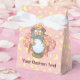 Vieux sorcier avec cape rose regardant la boule de cristal magique.