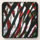 Abstraktes Foto mit breiten, zufälligen Streifen, verwoben in, kühne Farbtöne von, schwarz, rot, dunkelgrün, olivisch und weiß ähneln, Stiele aus Bambus.