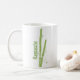 Stilvolle weiße Keramik Tasse mit Grafiken von grünen Bambusstalks. Grüner Text auf beiden Seiten der Tasse lautet Namaste. Personalisieren Sie den Text, um zu lesen, was Sie gewollt haben. Liebliche Geschenkidee für jedermann in Yoga oder Meditation.