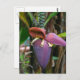 Farbtöne von lila und grün in einem auffallenden Bananenblütenbild auf Postkarte