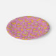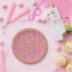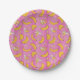 Niedliches und lustiges gelbes Bananenvektor-Muster auf einem magentafarbenen Streifen Hintergrund hat ganze Banane, einige geschält und ein geschnitten Stück auf diesem illustrierten Druck. Ein lustiges, illustriertes Design für jede Wohngestaltung.