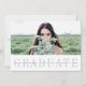 Le faire-part photo moderne de graduation présente votre photo préférée orientée paysage ou horizontale à l'avant, avec "gradué" affiché sous l'élégant lettrage gris-bleu. Personnalisez avec votre nom, l'école et l'année de diplôme sur une simple couverture blanche rayée. Les cartes sont retournées à une photo supplémentaire avec une bande le long du fond pour personnaliser avec les plans du diplômé pour le collège ou la carrière. Un choix élégant et moderne pour les diplômés 2017.