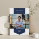 Customisez ce faire-part moderne de graduation avec une photo horizontale ou orientée paysage sur une bannière ruban en bleu marine classique. Ajoutez le nom de votre diplômé, l'école et l'année de fin d'études. Personnalisez le dos avec une photo supplémentaire et un message personnel.