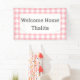 La bannière Welcome Home personnalisable est dotée d'une bordure classique en buffle rose et blanc avec votre texte dans un rectangle blanc au centre. Personnalisez-le dans la barre latérale. Copyright ©Claire E. Skinner. Tous droits réservés.