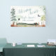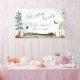 Adventure Await bannière. Le design se compose d'une scène de montagne avec des arbres et une texture aquarelle. D'autres articles de fête sont disponibles à la boutique Metro-Events Zazzle et à Metro-Event.com.