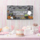 Bannière baby shower d'Halloween mignonne avec un bébé est le thème brassant avec un fantôme sorcier, un chaudron brassant quelque chose de vert et de bulle, deux chats et citrouilles et un crâne et un corbeau, chauves-souris volantes et champignons et araignées dans une palette de couleurs Halloween neutre genre. Bannière de baby shower Halloween neutre pour les femmes avec un bébé est thème brassant avec des illustrations curieusement mignonnes.