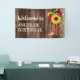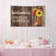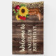 Bannière de bienvenue d'anniversaire conçue avec des bottes de cowgirl, des tournesols et des roses rouges sur un arrière - plan en bois rustique, parsemée de parties scintillant pétillante. Personnalisé avec le nom de l'invité d'honneur. Parfait pour votre cowgirl, pays, ranch ou fête d'anniversaire de grange.
