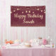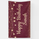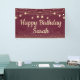Bannière personnalisée "Joyeux Anniversaire" avec parties scintillant dorée et lampes à cordes sur un élégant arrière - plan bordeaux. Personnalisé avec le nom de l'invité d'honneur.
