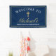 Bienvenue famille et amis à la première sainte communion de votre fils avec cette première sainte bannière de bienvenue de la Croix d'or chic. Cette bannière de bienvenue de la 1ère communion présente une simple croix d'or contre un arrière - plan bleu marine de classe. Personnalisez avec le prénom de votre enfant.
