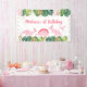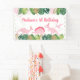 Cette adorable bannière d'anniversaire présente des feuilles d'aquarelle tropicale ornés d'ornements en parties scintillant dorée et de dinosaures roses.