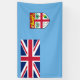 Ce dessin présente le drapeau national de Fidji (officiellement connu sous le nom de République de Fidji), un pays insulaire de Mélanésie, partie de l'Océanie dans l'océan Pacifique Sud. Le pays se trouve à environ 2 000 km au nord-est de la Nouvelle-Zélande. Fidji se compose d'un archipel de plus de 330 îles, dont environ 110 sont habitées en permanence, et de plus de 500 îlots, soit un total d'un peu plus de 10 000 km de carré. Le groupe insulaire le plus excentré est Ono-i-Lau. La grande majorité de la population fidjienne vit sur les deux principales îles, Viti Levu et Vanua Levu. Près des trois quarts des Fidjiens vivent sur les côtes de Viti Levu : dans la capitale Suva ou dans des centres urbains plus petits comme Nadi, où le tourisme est la principale industrie locale, ou à Lautoka, où l'industrie de la canne à sucre domine. L'intérieur de Viti Levu est peu habité.