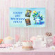 Bannière personnalisée sur le thème Axolotl bleu et vert pour la fête d'anniversaire du garçon. Un axolotl mignon dans un casquette d'anniversaire avec des ballons.
