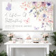 Bannière horizontale pour une Baby Shower "Une vie de papillons". Ajoutez une touche de romance fantaisiste à votre baby shower avec cette charmante bannière horizontale, parfaite pour une célébration sur le thème "Une vie de papillons". L'illustration présente un mélange délicat de fleurs sauvages aquarelles et de verdure, avec de multiples papillons roses et violets voltigeant sur la mise en page. La palette de couleurs comprend des tons rose saumon, rose poussiéreux, lilas, lavande, violet et des verts frais pour un look doux et inspiré du jardin.