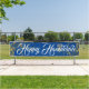 Cette bannière de vacances est présentée dans le style extérieur. Choisissez à l'intérieur ou à l'extérieur, avec ou sans grommets. Montré en bleu avec le texte blanc "Happy Hanoukka" dans un script sophistiqué avec deux tourbillons d'étoiles à l'aspect or à chaque extrémité. Customisez ou achetez comme prévu.