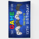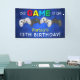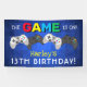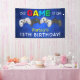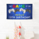 Bannière de fête d'anniversaire de jeu cool. Super fun et coloré avec un arrière - plan pixel bleu, le texte "THE GAME IS ON!", quatre contrôleurs de jeux vidéo et le nom et l'âge des enfants d'anniversaire. Cet accessoire de fête fait un petit ajout cool à une fête d'anniversaire.