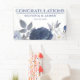 Bannière Mariage Floral Gris d'été pour vos accessoires de réception. Conçu avec des fleurs d'aquarelle dans les tons bleu et gris doux, sur un arrière - plan blanc. Le texte comprend : FÉLICITATIONS!, Les prénoms de la mariée et de la mariée et la date du Mariage. Pour personnaliser, insérez simplement vos détails dans notre modèle facile, en remplaçant l'exemple de texte. N'oubliez pas de consulter la collection entière de Mariages floraux gris-bleu d'été pour les cartes et accessoires correspondants.