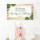 Célébrez dans le style avec cette bannière d'accueil mariage design et très tendance. Le design se compose d'un arrière - plan chic rayé blanc et doré effet feuille avec des feuilles de palmiers tropicaux et un libellé assorti dans une profonde ombre de vert... étonnant et tout simplement parfait pour tout couple planifiant une destination ou une célébration mariage sur le thème de la plage. Ce design est facile à personnaliser avec votre libellé d'événement spécial et vos invités seront ravis quand ils verront cette bannière fabuleuse.