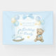 Image d'anniversaire avec un arrière - plan bleu, avec un ours avec un arc bleu autour du cou, un cheval blanc à bascule avec des points bleus, des ballons bleus et beiges