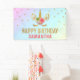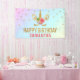Éblouissez vos invités avec cette mignonne bannière de fête d'anniversaire à thème unicorne avec un beau visage de licorne de parties scintillant en faux or et de jolies fleurs avec la typographie de parties scintillant en faux or sur un arrière - plan pastel dégradé arc-en-ciel.