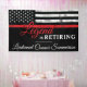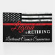 Cette conception comprend un drapeau de pompiers avec des rayures noires et blanches, ainsi qu'une fine bande rouge. Le texte "La légende prend sa retraite" se trouve au-dessus du nom du pompier, lieutenant ou chef qui prend sa retraite. Fêtez dans le style !