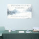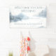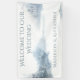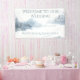 Bannière de réception de mariage bleu et blanc conçue avec une scène hivernale de neige en chute douce avec des accents de bois bleu. Le texte comprend : Bienvenue à notre Mariage, et les prénoms de la mariée et de la mariée. Pour personnaliser, insérez simplement vos noms dans notre modèle facile, en remplaçant l'échantillon. Assurez-vous de voir la collection entière de Mariages de neige d'hiver Bleu et Blanc. Bon appétit !
