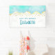Bannière d'anniversaire avec un design estival serein. Image turquoise / aquarelle vert aqua avec une bordure ondulée en faux or. Élégant et adorable.