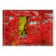 Die Zement- und Ziegelmauer der Burg auf der Insel Bannerman ist von farbenfrohen Rotweinen bedeckt, während durch eine Fensterwand gelbe Blätter zu sehen sind.