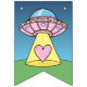 Joyeux anniversaire, Earthling ! Organisez une fête sur le thème de l'alien hors du monde avec ces charmants drapeaux de Bunting Anniversaire Pink UFO. Le design présente une illustration numérique d'un OVNI rose et violet qui projette un coeur rose. Il plane dans un ciel bleu foncé au-dessus d'une colline verte et herbacée. Cette conception de vaisseau spatial est parfaite pour une fête célébrant l'amant de l'espace dans votre vie.