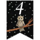 Cette bannière en forme de drapeau Happy Birthday est noire avec des étoiles blanches et une jolie chouette brune assise sur une branche d'arbre portant un collier bleu. Customisez l'année d'anniversaire avec les modèles.