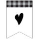 Le design est classique et moderne ! Il a un motif de buffle plaid en noir et gris. Il dit "JUST MARRIED" avec de beaux coeurs.