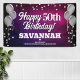 Banderole amusante pour l'intérieur ou l'extérieur, avec des ballons métalliques argentés festifs des deux côtés du design avec des confettis métalliques brillants et argentés sur un riche arrière - plan texturé rose chaud et violet pour votre bannière d'anniversaire personnalisée. Ce produit sert aussi de merveilleux gardiens d'anniversaire.