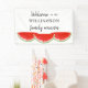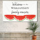 Cette bannière de bienvenue familiale est décorée de pastèques couleur rouge. Parfait pour votre barbecue d'été en famille, pique-nique ou cuisine. Facile à personnaliser. En créant notre oeuvre, vous ne trouverez pas cette image exacte d'autres créateurs. Aquarelle originale © Michele Davies.