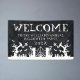Bannière de fête d'Halloween éffrayante en noir et blanc ou signe d'accueil personnalisé avec le nom de famille et l'année. Doté d'une porte de maison hantée, d'arbres effrayants avec des visages, des chats, des chauves-souris, un cimetière avec des pierres tombales, et un arrière - plan de toile d'araignée.