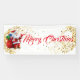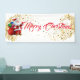 Cette bannière de Noël est présentée dans le style intérieur. Choisissez à l'intérieur ou à l'extérieur, avec ou sans grommets. Montré en blanc avec le texte "Joyeux Noël" avec Père Noël et le script fantaisie avec deux tourbillons d'étoiles à l'aspect or à chaque extrémité. Customisez ou achetez comme prévu.