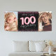 Bannière de fête du 100e anniversaire de marque avec un arrière - plan noir tendance, 2 grandes photos, parties scintillant rose étincelante, 100 ballons d'hélium rose, et un modèle de célébration personnalisé facile à personnaliser.