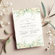 Elégante invitation botanique aquarelle pour le baptême, le baptême ou la dédicace de votre enfant encadre votre cérémonie d'église et les détails de la fête avec une bordure de verdure pastel pastel et feuilles. Une minuscule croix complète le design.