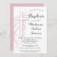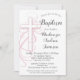 Une jolie invitation au baptême blanche et rose avec une croix blanche et des tourbillons roses l'entourant.