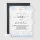Un baptême moderne et élégant, célébrant un bébé garçon. Arrière - plan blanc décoré avec des étincelles de parties scintillant bleue et une croix d'or. Personnalisez et ajoutez un nom et des détails du parti. Lettres de couleur noire.