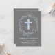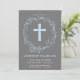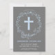 Ce invitation moderne baptisme ou baptême présente une élégante couronne de fleurs bleues à l'aquarelle ainsi qu'une croix bleue. Idéal pour la célébration religieuse d'un petit garçon, il peut être customisé avec le nom de votre enfant et les détails de l'événement.