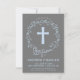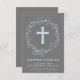 Ce baptême moderne ou invitation de baptême comporte une guirlande florale bleue de style élégant d'aquarelle aussi bien qu'une croix bleue. Idéal pour la célébration religieuse d'un bébé, elle peut être customisée avec le nom de votre enfant et les détails d'événement.