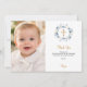A modern and elegant baptism thank you card. A chic white background decorated with a watercolored blue floral wreath, a bow and a golden cross. Personalize and add your photo of the child, thank you note and name.