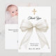 A modern and elegant Baptism thank you card. A white background, decorated with a large ivory colored bow with pearls and a golden cross. On the front the text: Thank You, name, and a date.
