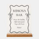 Complétez votre thème de shower de mariage "tying the knot" avec cet élégant panneau acrylique personnalisé pour un bar à Mimosa avec un nœud noir. Conçu pour correspondre au thème de shower de mariage "shes tying the knot" noir et blanc, ce panneau est une touche stylée pour votre célébration. Parfait pour mettre en valeur votre station de boissons, il complète les idées de shower de mariage "tie the knot" en noir. Que vous planifiez un thème de shower de mariage "shes tying the knot" ou que vous ayez besoin d'idées pour un shower de mariage "tie the knot", ce panneau chic améliore votre thème de shower de mariage "tying the knot" en noir.