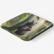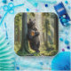 Ein Bär steht leise gegen einen Baum, der eine Tasse Bier mit einer Pfote in einem sonnigen Wald hält