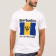 Ein editable Titel und ein Slogan begleitet den schwarzen Trident über den blauen und gelben Bändern der barbadischen Flagge auf der Front dieses T - Shirt. Die Rückseite zeigt eine ausführliche Karte von Barbados an.