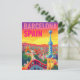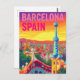 An extremely vibrant and graphic vintage-style travel poster for Barcelona, Spain. The artwork features the colorful, unique architecture of Gaudi against a stunning pink and orange sunset skyline. This bold retro illustration is perfect for lovers of Spanish cities, modern art, and highly stylized travel posters.