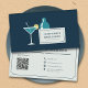 Eine Visitenkarte mit einer Abbildung eines Cocktail-Shakers und eines Martini-Glases auf dunkelblauem Hintergrund. Ideal für einen Barkeeper, ein Pub, einen Mixologen oder einen Party-Barkeeper. Auf der Rückseite finden Sie vollständige, anpassbare Informationen und einen QR-Code.